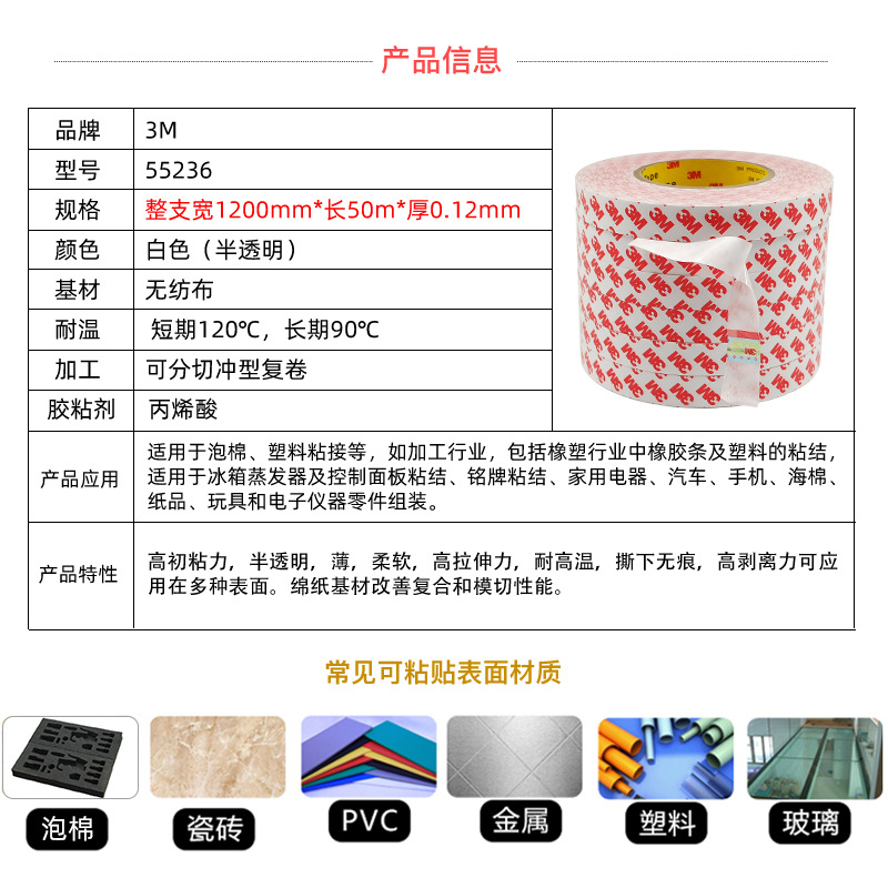 正品3M55236双面胶带 超薄强力无痕双面胶耐高温半透明无纺布胶纸